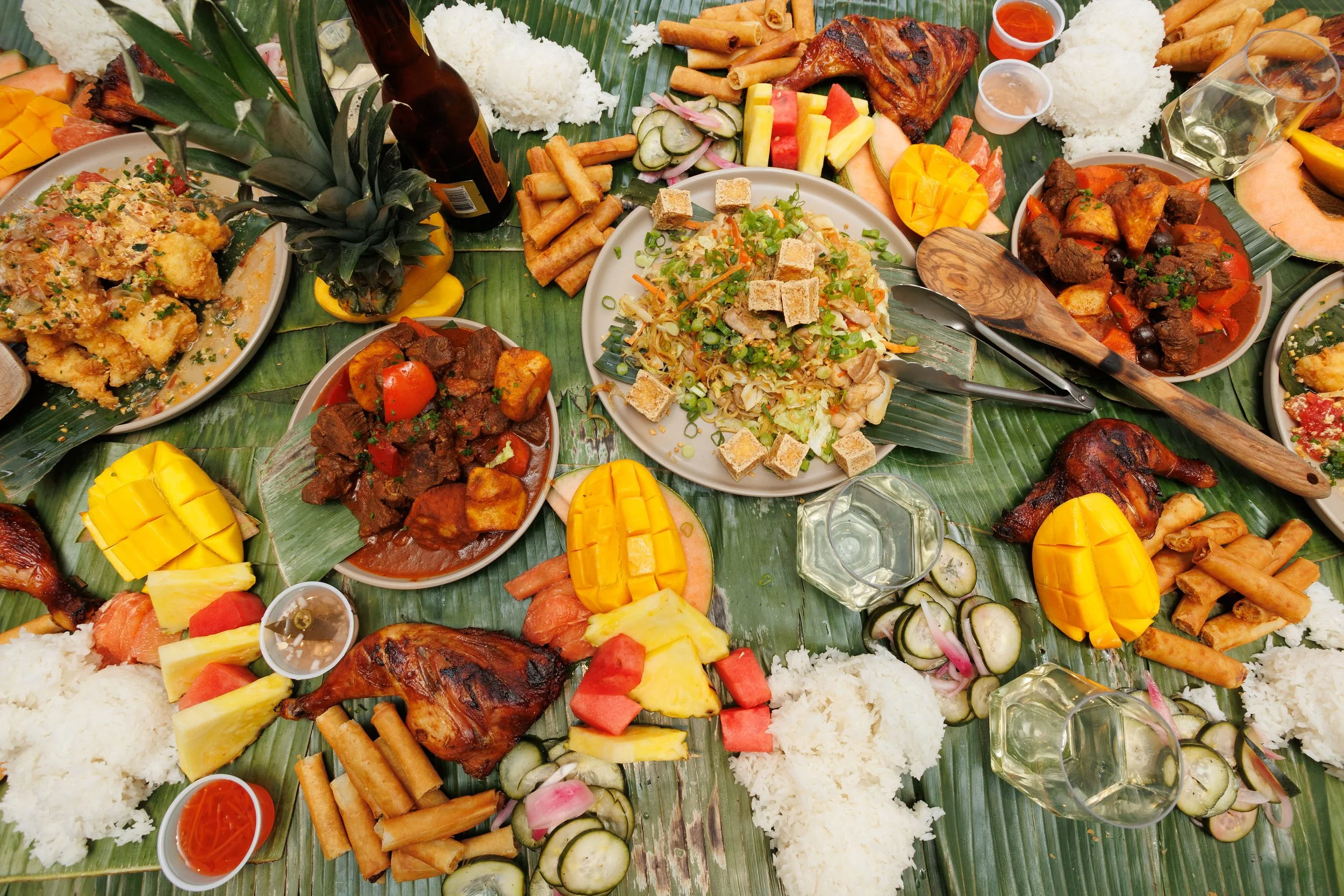 Kamayan means eating with your hands. We set the table with banana leaves, then lay out steamed rice, grilled meats, vegetables, and condiments right down the middle. Everyone gathers around the table and eats together using their hands. It’s strongly connected to the older communal tradition called a ‘boodle fight,’ popularized in the Philippine military, where food is piled onto banana leaves and everyone shares—no plates, no utensils, just community.
