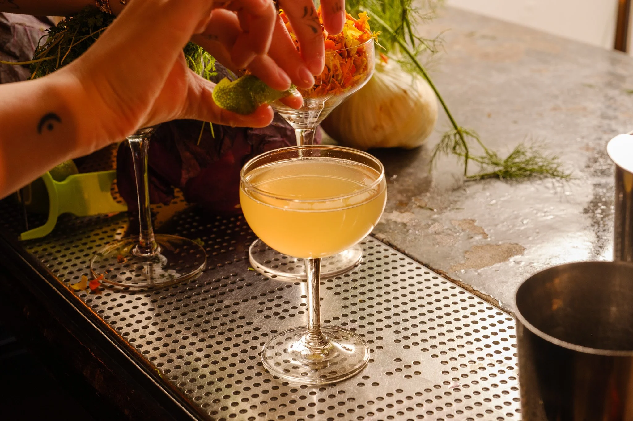 The build: Add all your ingredients to a tin. Fill with ice, shake, strain into a coup. Garnish with a lime twist.