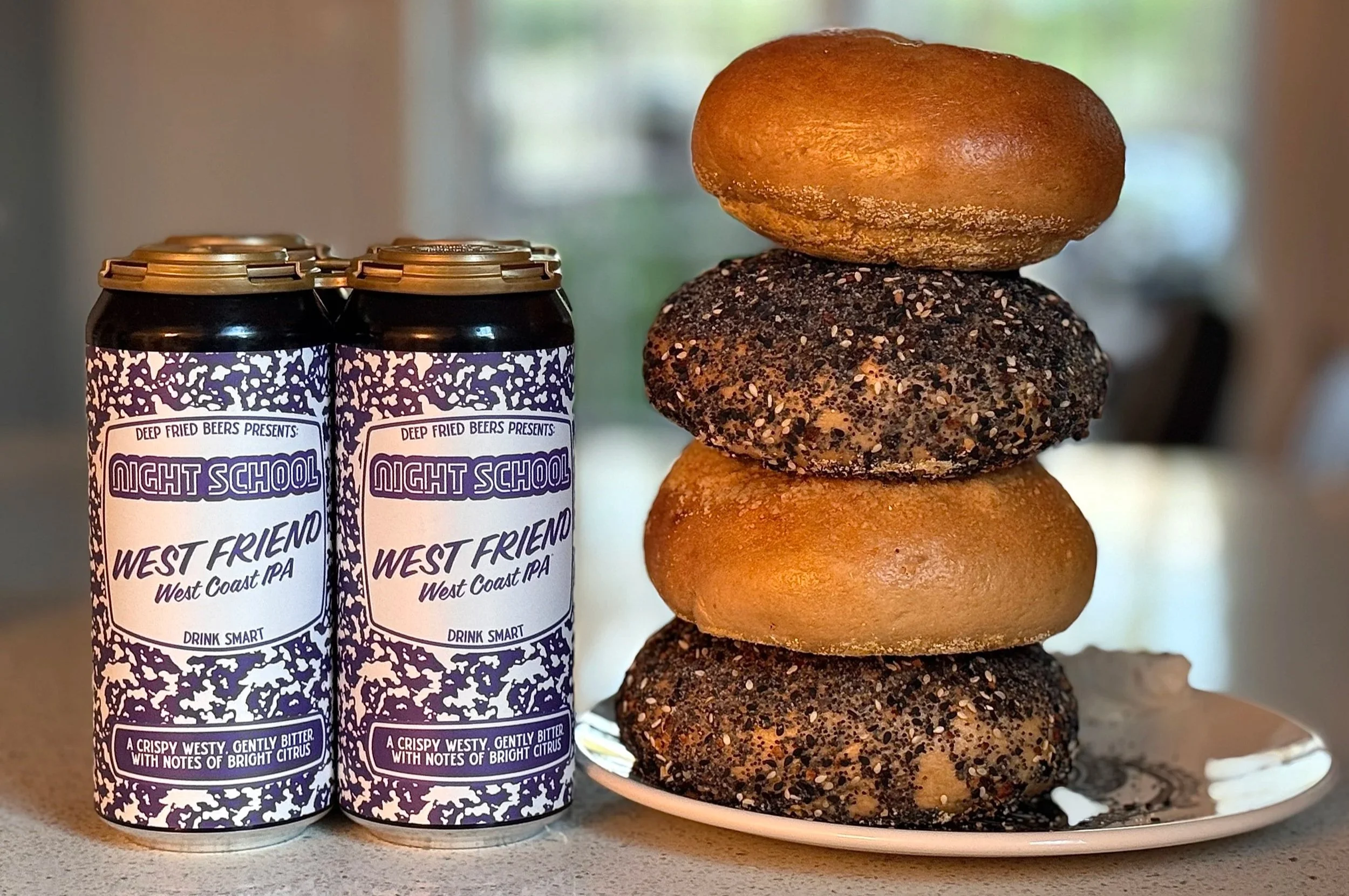 Chatting to head brewer Johnny Osborne, founder of Night School, a pizza parlor, cocktail bar and home of Deep Fried Beers in the former Crossroads Brewing space on 2nd Street in Athens, N.Y., it’s clear his mind is permanently in create mode dreaming up the next craft beer or offbeat toppings of their famously huge pizza pies. (Johnny used to work at Paulie Gee’s in Brooklyn.) When The Dishing x Night School collaborated on a beer giveaway for New York’s April 11 Craft Beer Day, I should have been less surprised to learn he’d expanded his kitchen experiments from pizza dough to bagels. Currently available fresh-made on Saturdays at noon when Night School opens, you can treat yourself to Osborne’s crisp-shelled, fluffier-than-most, boiled bagels + their house-made cream cheese flavors, built on a base of Philadelphia cream cheese. I asked Johnny to give us the details: