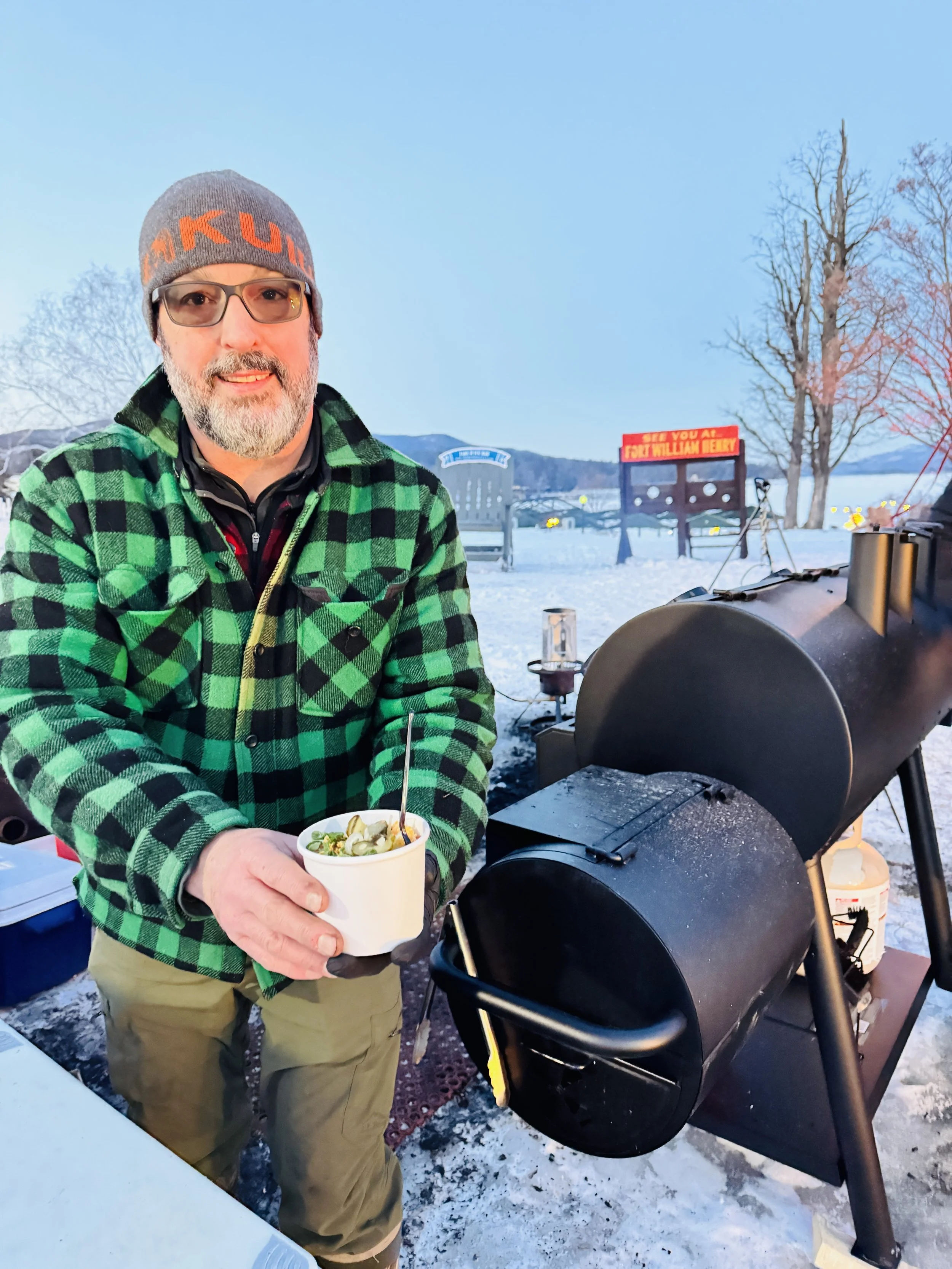 Walk through the Lakeside Restaurant and Lounge at Fort William Henry Hotel to their lake-facing ice bar, ice sculptures including ice cannons, live music, fire pits, smoker chili and specialty cocktails. Executive Chef John Holmes is making is his famous Texas-style chunky beef chili topped with sweet housemade bread and butter pickles. It’s superb.