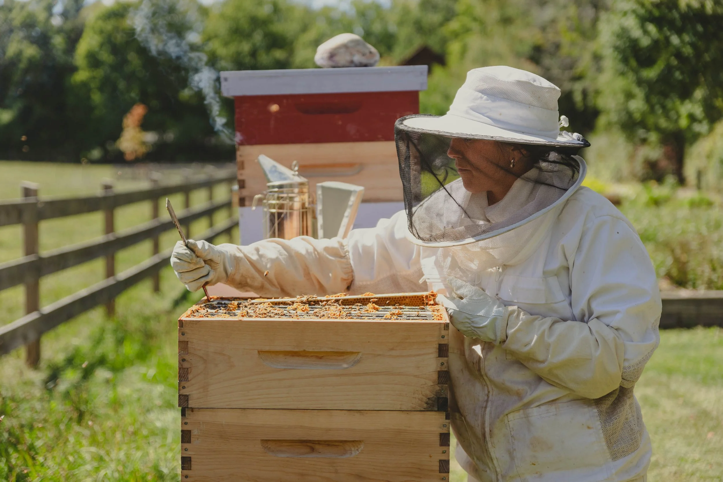 Now I’m really excited to ask you about your journey into beekeeping. I think it’s been one of my favorite shoots so far seeing you don all the beekeeping gear and calming the hives with smoke. Start at the beginning: How did you get into it and how it’s going with the hives at June Farms?