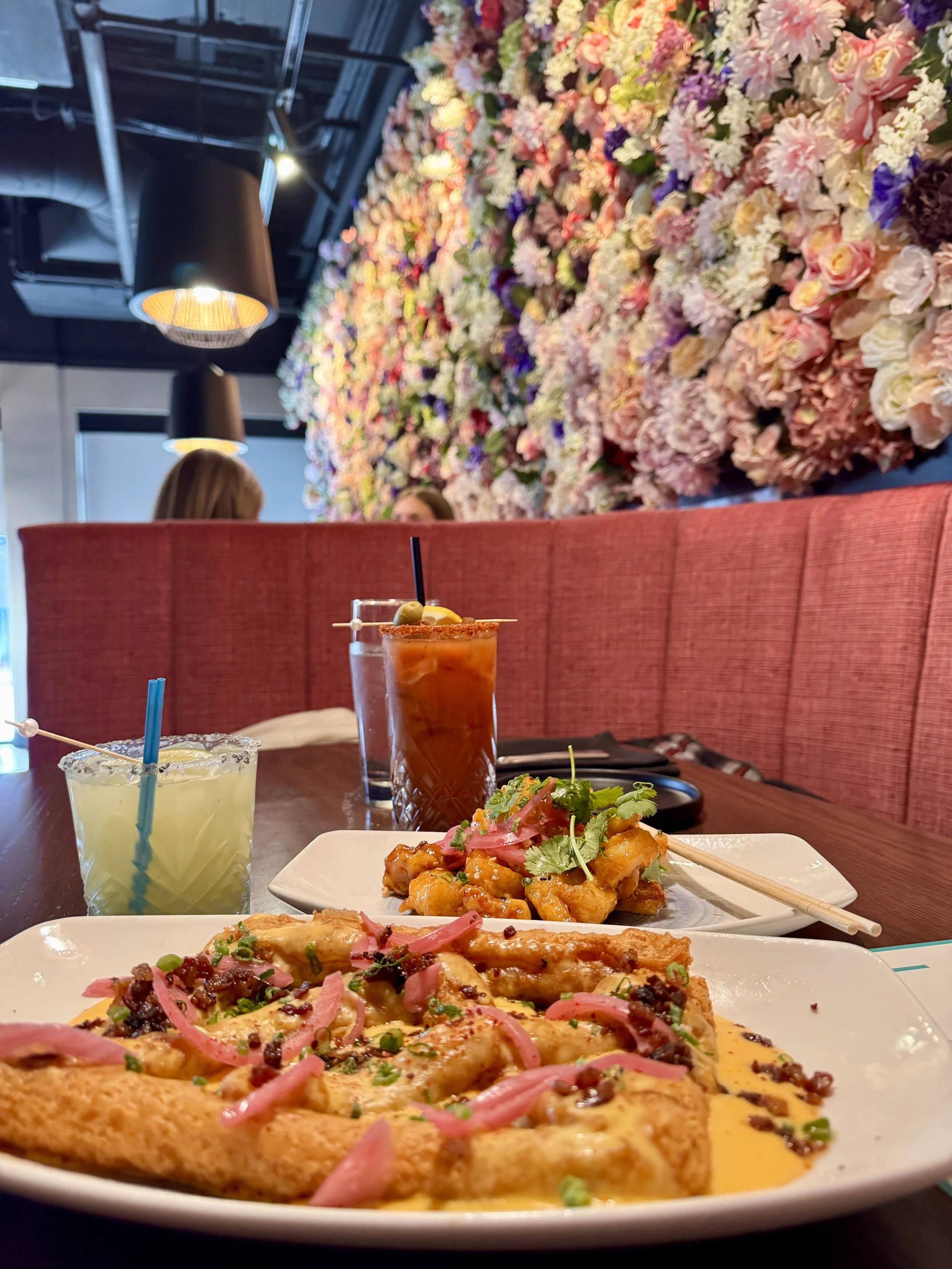 Stacked bananas foster pancakes are shockingly good with fresh cream, toasted pecans and a warm brown sugar rum glaze ($17), thoough it might be a fight between that and apple streusel French toast. Food is fast casual, bright and unfancy like sticky tempura battered bang bang shrimp, shrimp tacos and an 8-oz burger topped with fig jam, arugual and bleu cheese. Everything comes out fast—in our case before drinks hit the table—including a curious Loaded Potato Funnel Cake which appearss to make use of the churro extruder to pipe and fry mashed potato served up a criss-cross pattern, scattered with bacon and in a cheese sauce puddle. Look, it’s not great or upscale, but it’s something for the ‘gram.