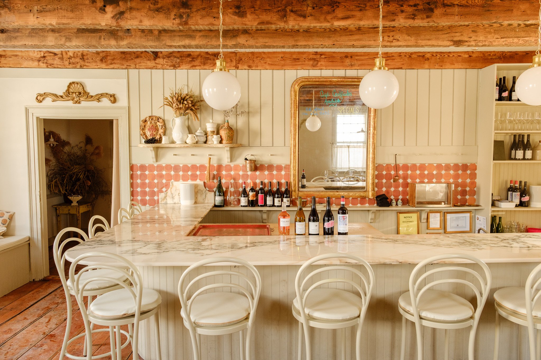 Vibe/Style: Cozy European wine bar. Light, airy, shabby-chic French country meets European enoteca, with soft whites, linen cushions and vintage plates; a long marble bar anchoring the space.